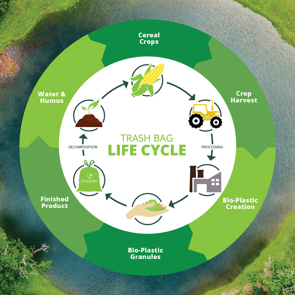 Our bags start as renewable crops like corn and cereal grains, transformed into biodegradable plastic granules. Crafted into durable bags, they serve you every day, then naturally break down into water and humus when composted — closing the loop for a cleaner planet.