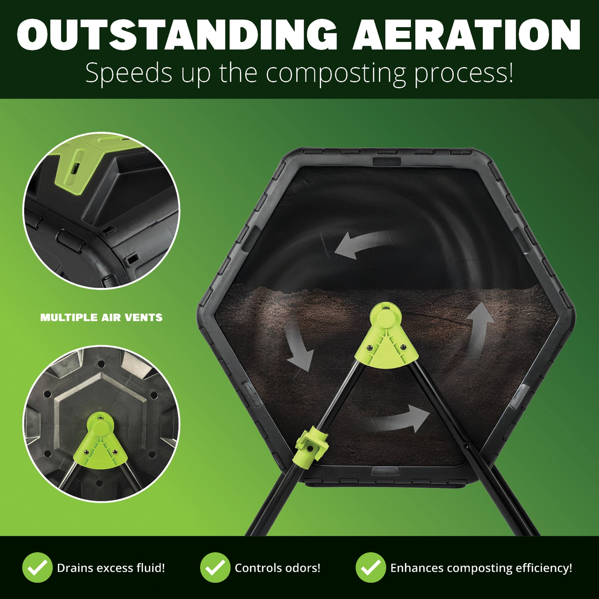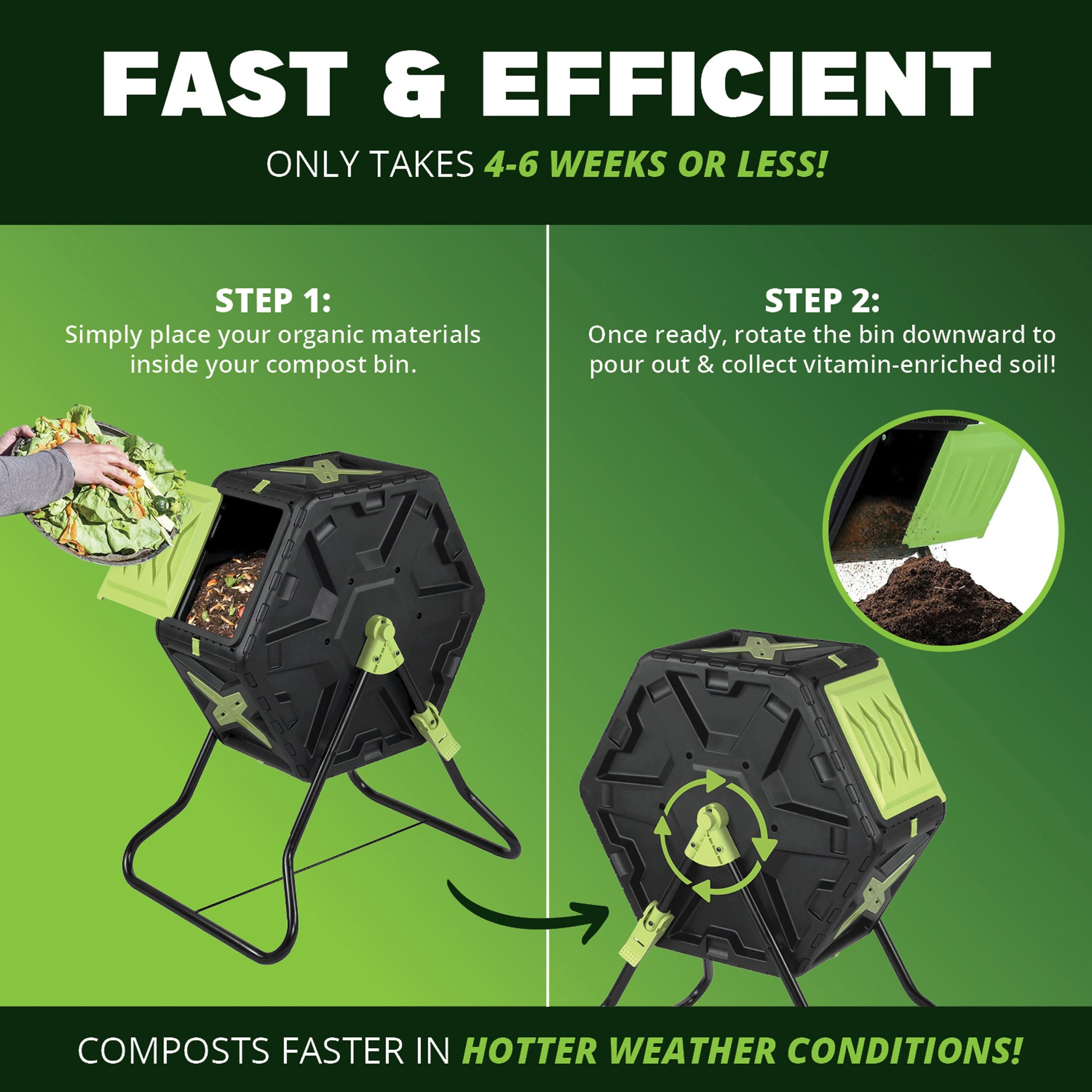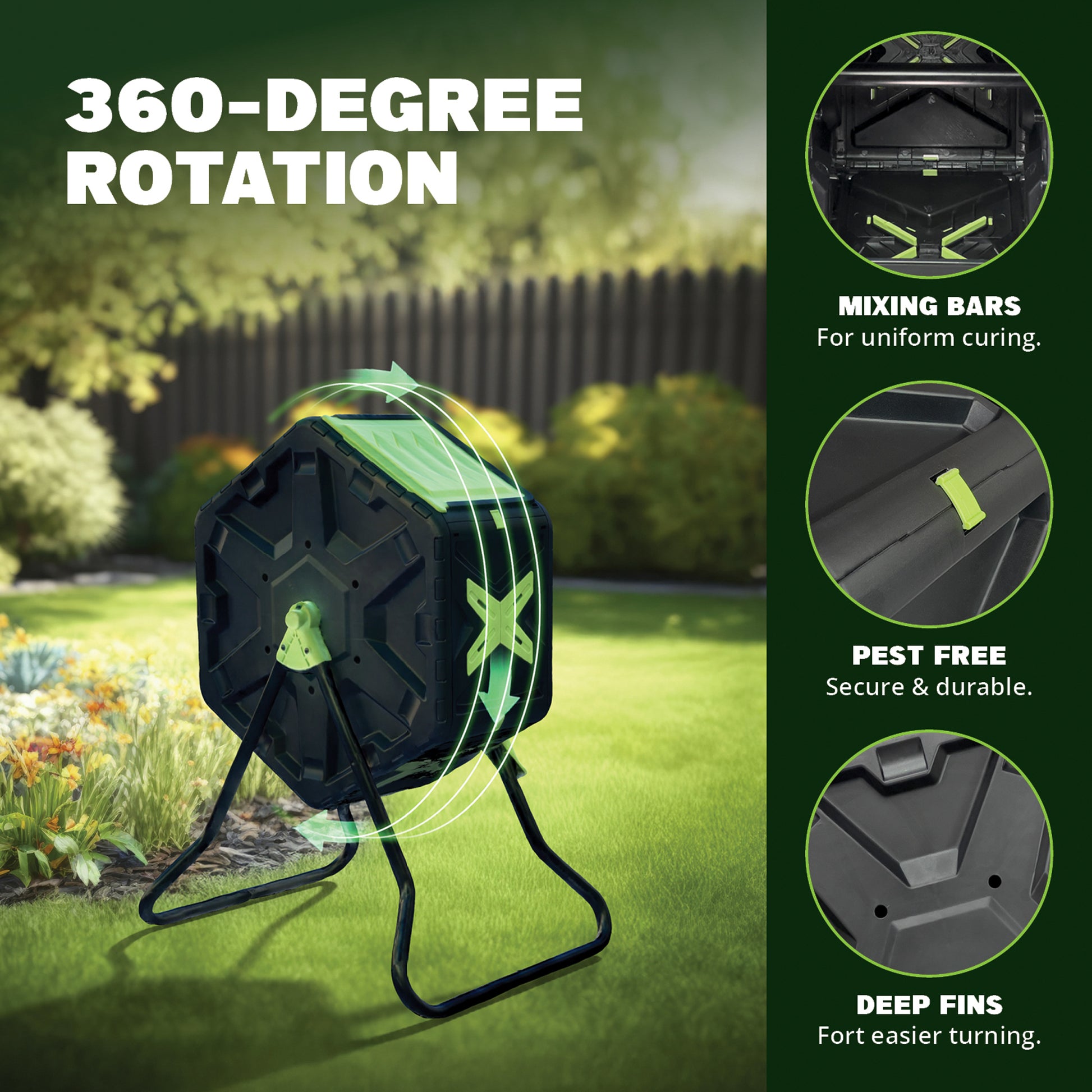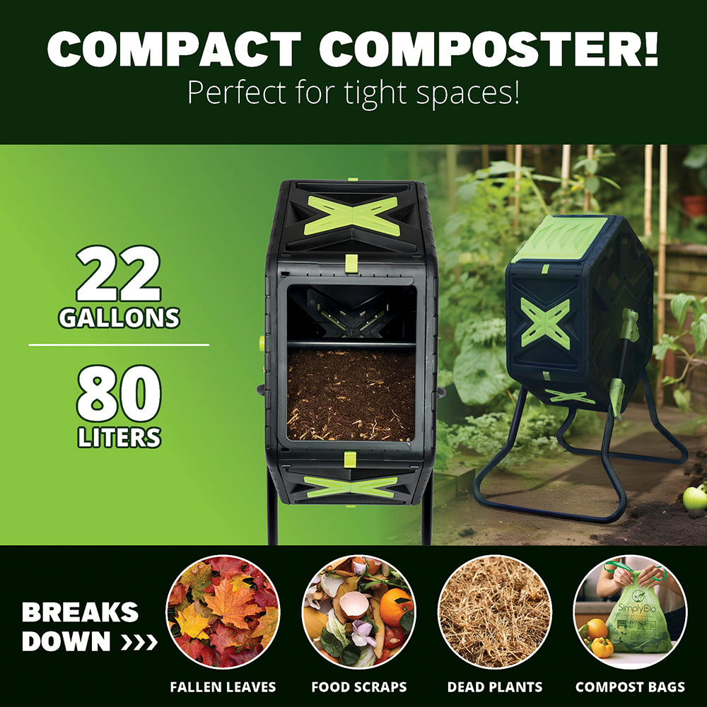 The Simply Bio Compost Tumbler Bin is a durable and eco-friendly solution for effortless composting. Made from BPA-free, UV-resistant plastic, it withstands outdoor conditions while promoting sustainable waste management. Its 22-gallon dual-chamber design allows continuous composting—add fresh waste to one side while the other cures for nutrient-rich compost. The rotating drum ensures efficient aeration and even mixing, accelerating the decomposition process. A sealed, ventilated design controls odors and prevents pests from accessing your compost. With a quick and easy 5-minute assembly, the Simply Bio Compost Tumbler makes composting simple, efficient, and mess-free.